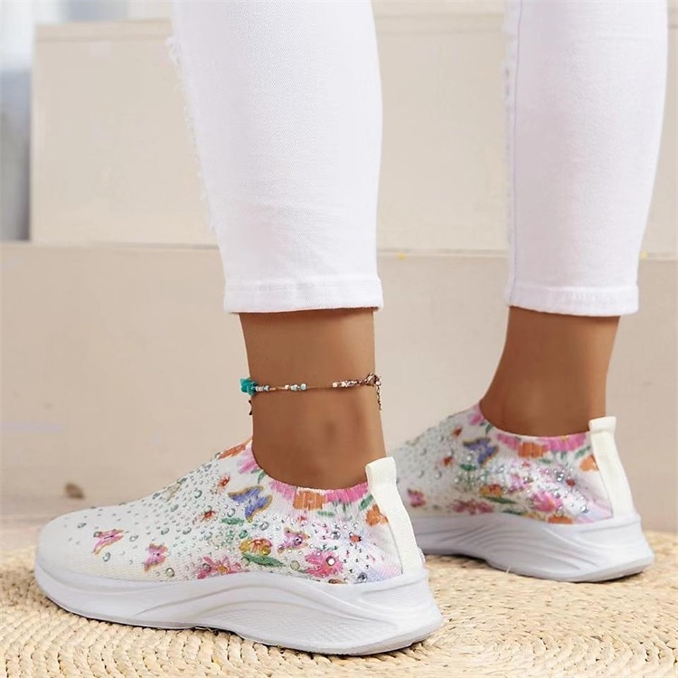 Women's White Slip-On Sneakers with Floral Print and Rhinestones for Casual Wear